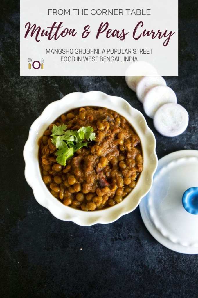 The ‘mangsho ghughni’ is a variation on the much-loved Kolkata street food ‘ghughni’ in which dried yellow peas are cooked in a masala gravy and served in disposable bowls made of leaves and a wooden spoon. In most such cases, the ghughni (pronounced ghh-oo-ghh-nee) is vegetarian.